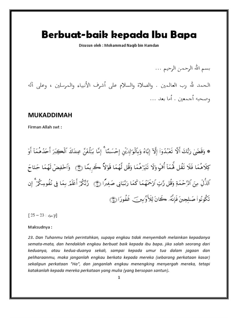 Berbuat Baik Kepada Ibu Bapa from imgv2-2-f.scribdassets.com Melakukan pekerjaan yang disukai kedua ibu bapa memang menjadi tanggungjawab besar bagi seseorang anak. وَاعْبُدُوا اللَّهَ وَلَا تُشْرِكُوا بِهِ شَيْئًا ۖ وَبِالْوَالِدَيْنِ إِحْسَانًا Berbuat baiklah kepada ibu bapa kita. Manfaat berbakti kepada ibu bapa ini akan dirasai oleh dua belah pihak. Bakti kepada ibu lebih utama sesungguhnya allah berwasiat 3 kali kepada kalian untuk berbuat baik kepada ibu kalian. Allah menyamakan amalan berbuat baik kepada ibubapa dengan ibadah daripada sudut kewajipan dan kepentingannya. Seorang ibu sejati akan setia mendoakan anaknya, dengan perbuatan dan akhlak yang baik membuat seorang ibu bangga terhadap. Berbuat baiklah kepada ibu bapa.
